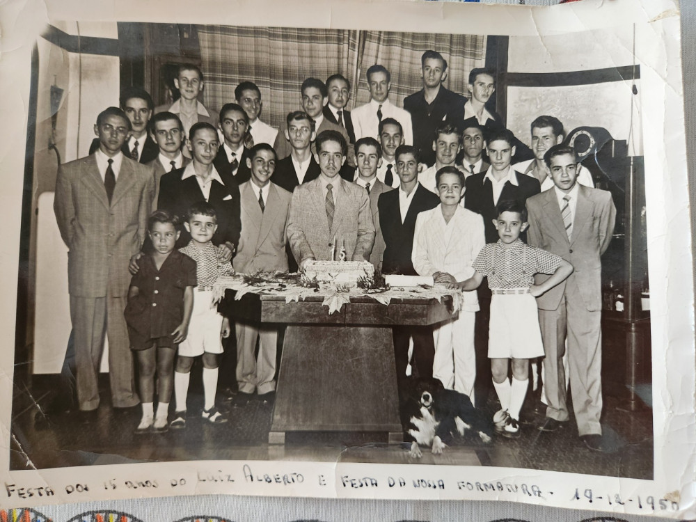 Na primeira fila está José Néri da Silveira, interno no Auxiliadora, quase sempre o primeiro aluno do educandário, lavrense e amigo da família, hoje aposentado Ministro do Supremo Tribunal Federal; a seu lado, o “locutor que vos fala”, abraçando duas crianças, uma delas possivelmente Orlando Carlos, irmão do aniversariante; logo João Henrique Bianculli Galo, que seria ícone da comunicação, ao lado de Luiz Alberto: depois Carlos Saraiva de Saraiva, competente médico em Brasília, vizinho de Antônio Cláudio Gómez de Souza, de terno branco e seu irmão Arlindo Fábio, de calças curtas. Pouco atrás é Oscar Alexandre Damásio, filho do agente da VFRGS e o conhecido ator Paulo José. Na segunda fila, Ilo Job de Borba, bancário, Júlio Costa Taborda, irmão de Tarcísio, convidado; Artur Guilherme da Silva Azambuja, exímio tenor; Salomão Chapper um dos mais estudiosos; Írio de Campos Pêgas, odontólogo, o pai com loja quase ao lado da igreja; Clóvis de Oliveira Menezes, sempre elegante e Luiz Carlos Neider Medina Quintana, companheiro de zona, traumatologista; Elias Abip Muza, irmão do Edgar, um dos fundadores da Juventude Estudantil Católica; Décio Mascarello, com seu riso contumaz. E na fila superior, Flávio Vinicius Araujo Pires, laboratorista, filho da Inspetora de Ensino Maria de Lourdes Araujo; Rui Antônio Costa, o pai era gerente do Banrisul; Eloy Genovese que seria dono de empresa de materiais de construção; Atila Ricardo Vinhas, fazendeiro e odontólogo assim como Liader Brito Previtali, odontólogo, desportista, político, e jalde-negro raiz assim como quem ladeia, outro odontólogo, Luiz Carlos Osório Alcalde, desportista e gestor. Finalmente meu irmão George, convidado, e que também aniversariava no dia 19 de dezembro. O ano, 1950.