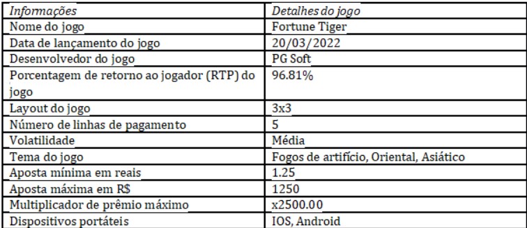 O Jogo do Tigre consiste em um campo de jogo de 3x3 e 5 linhas de pagamento. Além disso, o slot tem um RTP alto e uma ampla gama de apostas. As características detalhadas da máquina de jogo estão disponíveis na tabela.