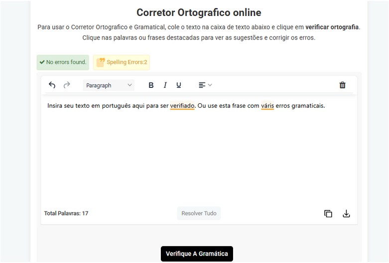 Revisar suas próprias tarefas para erros é uma tarefa muito demorada e chata, mas também é importante. Então, para acelerar o processo, os estudantes brasileiros podem usar este Corretor Ortografico. Ele detectará e destacará automaticamente todos os erros no texto fornecido com um único clique.