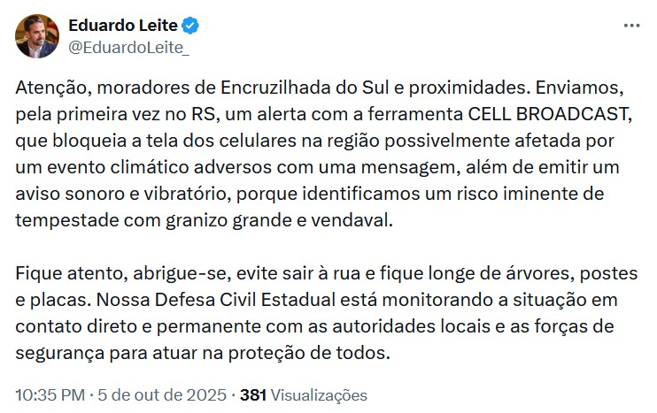 O alerta foi emitido na noite deste domingo (6) para moradores de Encruzilhada do Sul e municípios vizinhos, onde havia previsão de tempestade com granizo grande e rajadas intensas de vento. A mensagem bloqueou temporariamente a tela dos aparelhos e acionou um sinal sonoro e vibratório, mesmo em celulares configurados no modo silencioso. O texto também continha orientações de segurança à população.